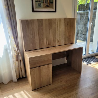 Intention : meubler la pièce de manière harmonieuse et pratique (espace bureau, rangements, cache-écrans, espace d'exposition)